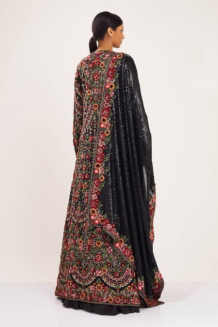 Black long jacket with multi-color floral motif thread work. Comes with crop top, lehenga & sheeted dupatta.
