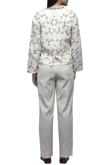 Off White Dobby Cotton Jacket Embroidered Pant Set