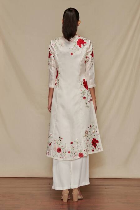 Ivory long jacket style tunic with floral embroidery. Come with inner slip and crepe pant.