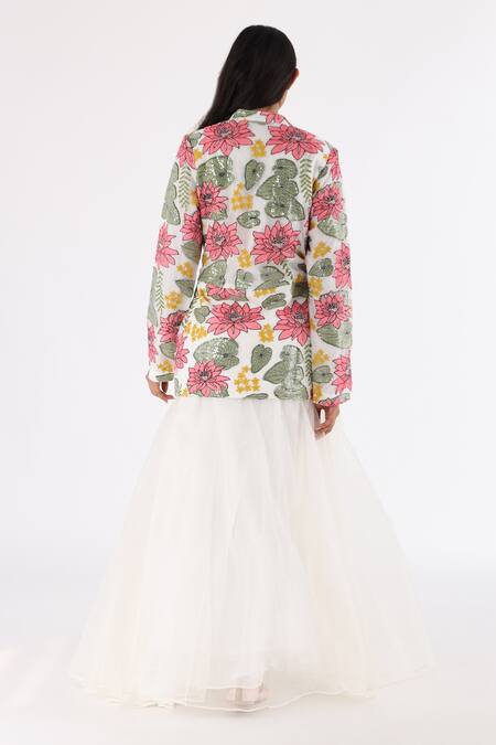 Off white net peplum jacket featuring a band collar and full sleeves with multi-color lotus pattern thread and sequin embroidery. Paired with a flared organza skirt that has an embroidered waistband and a concealed front closure.