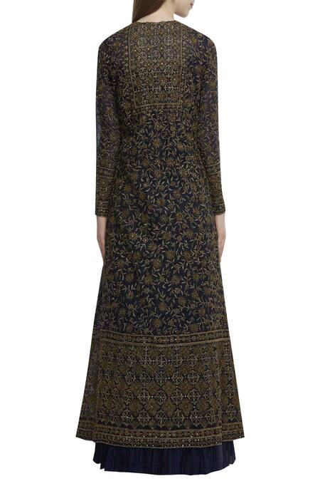 Midnight blue all over floral motif worked long jacket with sequin detail kurta. Comes with crushed skirt, bordered dupatta & cancan skirt.