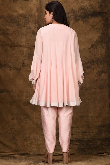 Pink Viscose, Bamboo, Georgette Embroidery, Tassels Round Kurta Dhoti Pant Set