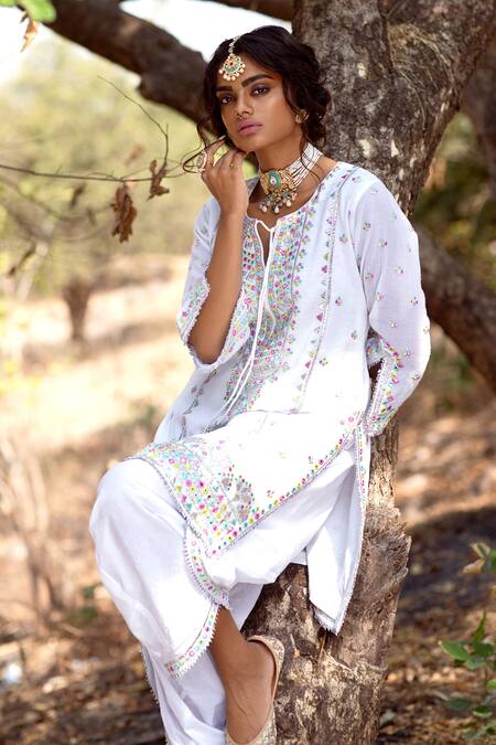 Ivory kurta with all-over multicolored mirror embroidery, notched neckline and slit on the sleeves. Comes with dhoti pant.