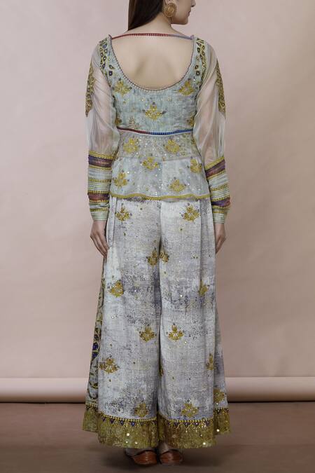Green tinted grey peplum kurta with all-over floral motif work. Comes with embellished gharara pants.