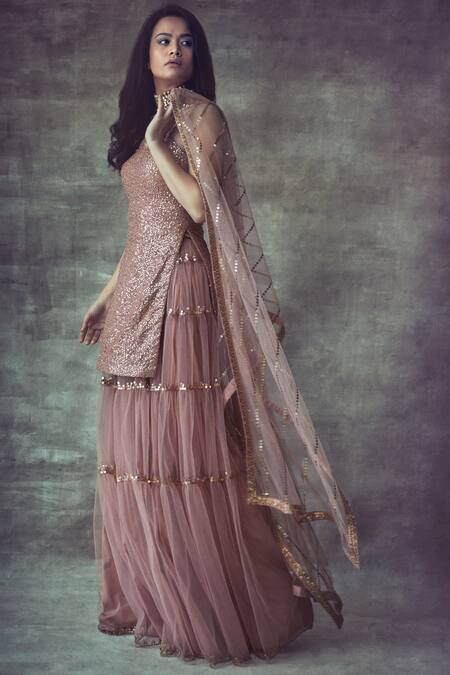 Pink short kurta with all-over sequin work & noodle straps. Comes with tiered gharara & embellished dupatta.