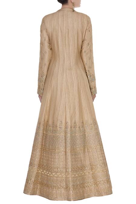Beige jacket-style kurta with front slit, placement embellishment & potli buttons. Comes with contrast lehenga.