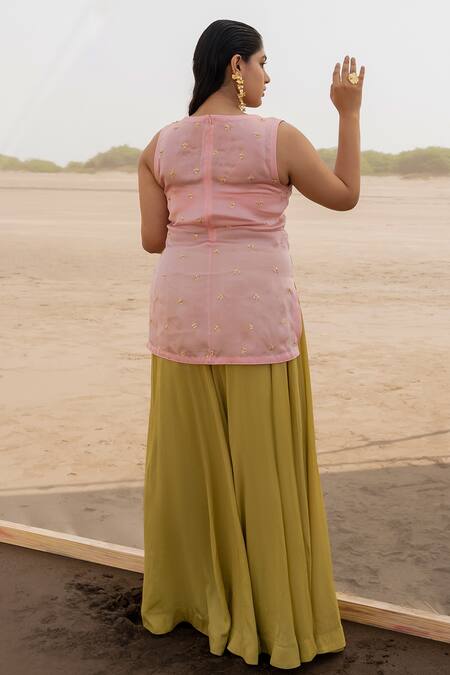 Baby pink V neck kurta with cutdana, tikki embroidered floral motifs. Paired with bralette, palazzo & dupatta.