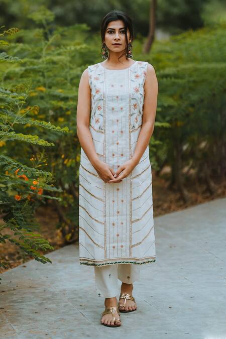 White long kurta with placement floral motif thread work. Comes with straight pants.