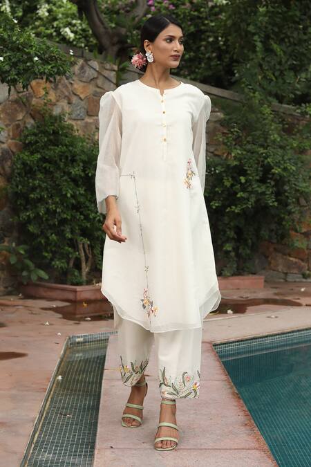 Ivory handwoven chanderi kurta featuring patchwork and sequins embroidery. Paired with a salwar adorned with floral embroidery at the hem.