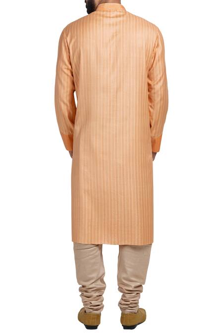 Peach & beige toned kurta with vertical striped self design all over and highlighted with embroidery across the collar, placket & cuff. Comes with a plain beige churidar.