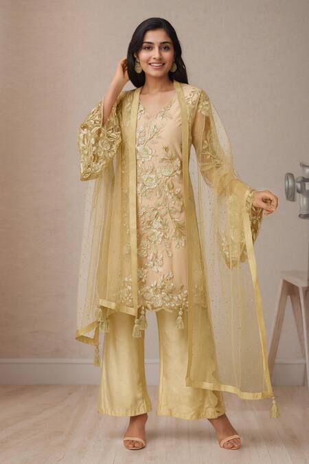 Gold Net, Organza, Bamboo Tassels Collared Embroidered Kurta Set