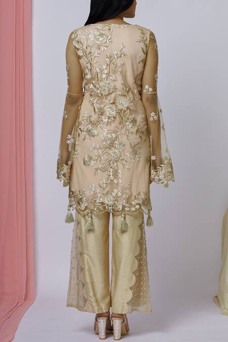 Tassel details on kurta and dupatta, Back scallop pattern on pants, Sequin and thread floral embroidery