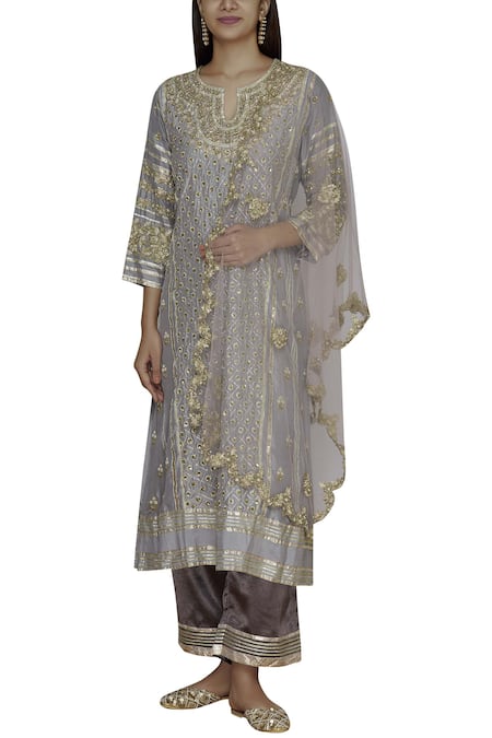 Buy_Aditi Beriwala_Grey Dupion Silk, Mushru Kurta Round Inner V Neck Embroidered Set_at_Aza_Fashions