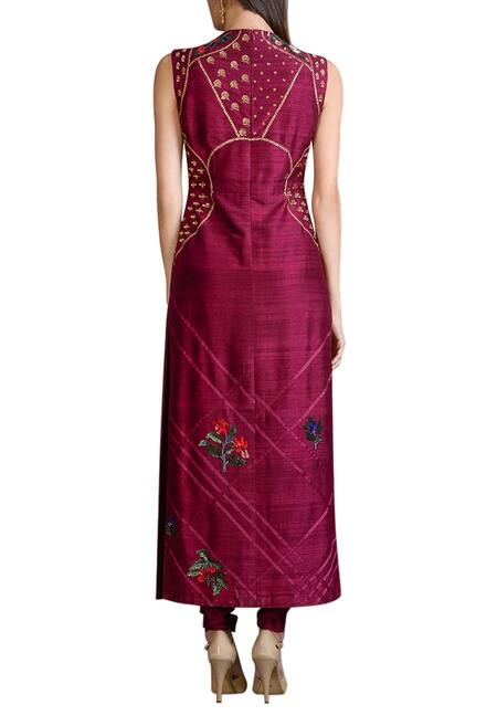 A wine high neck long kurta based in raw silk featuring floral hand embroidered motif in sequin accents. It is paired with a churidar. It fits true to its style.