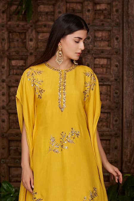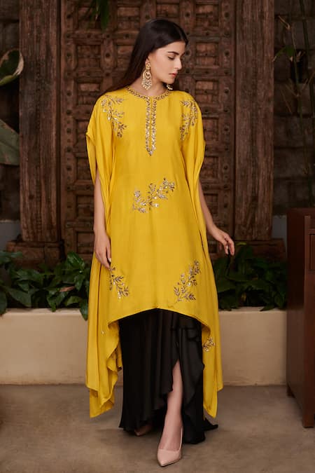 Yellow kaftan style kurta with floral embroidered motifs. Paired with draped skirt.