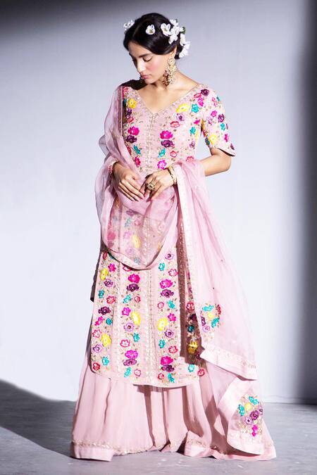 Dark rose gold kurta with multi-thread floral embroidered motifs. Paired with sharara & dupatta.