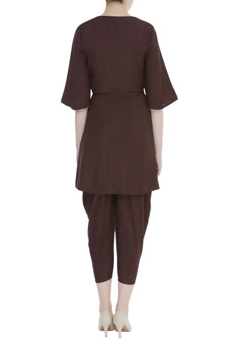 A classic and contemporary look this brown silk wrap kurta that is enhanced with thread work embroidery. It comes with balloon pants.