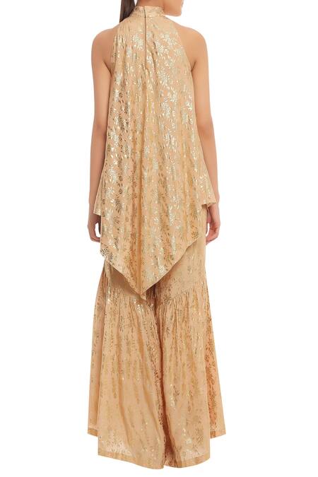 Embrace the modern-traditional look, this gold asymmetric kurta with blooming garden gold embrodiery all over. It comes with a matching sharara pant.