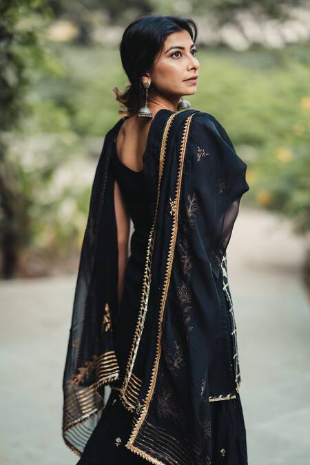 Buy_Kaia_Black Cotton, Organza Leaf Neck Embroidered Kurta Sharara Set_at_Aza_Fashions
