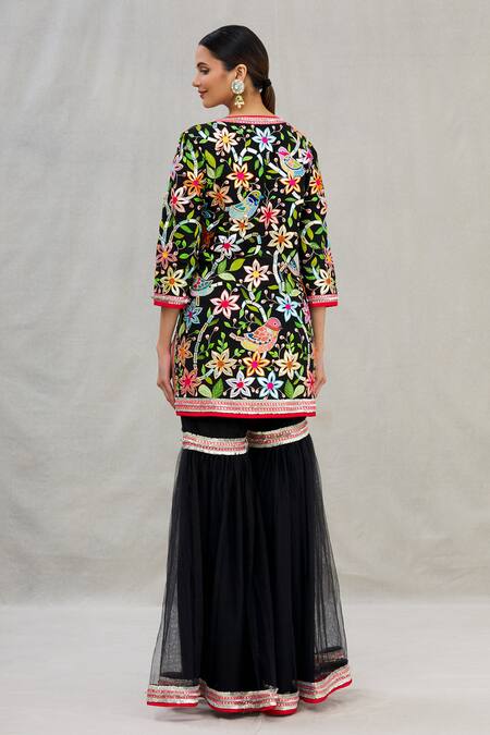 Black short kurta with all-over multi-color floral-bird motifs. Comes with sharara pants & embroidered dupatta.