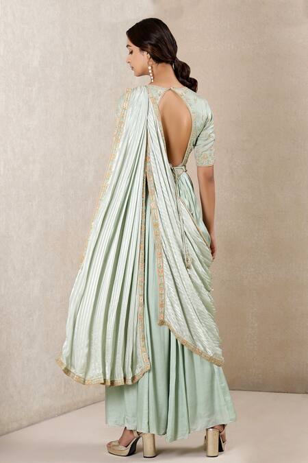 Mint kurta with floral embroidered motifs & round-neck. Paired with striped, embroidered border dupatta & embroidered belt.