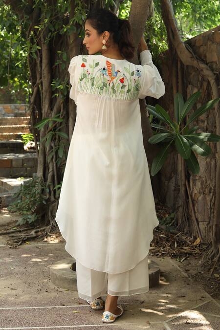 White kurta featuring bird resham embroidery on the high yoke and a front buttoned placket