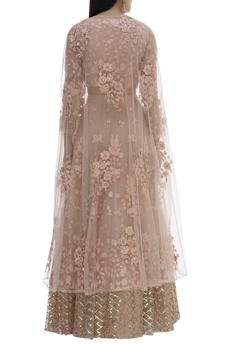 Pink lehenga with floral motif work paired with matching blouse & long cape.