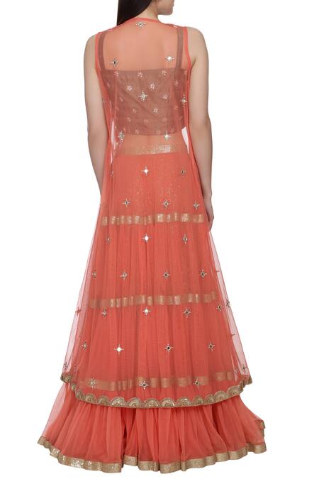 Coral hued tiered lehenga paired with mirror work blouse & long jacket.