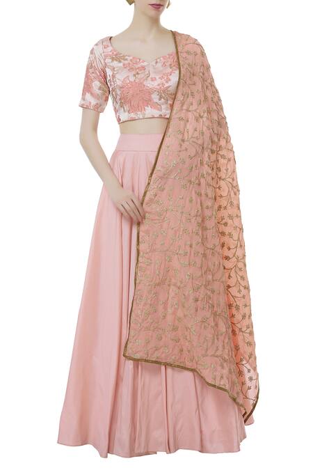Peach hued lehenga with off white floral work blouse. Comes with an embroidered dupatta.