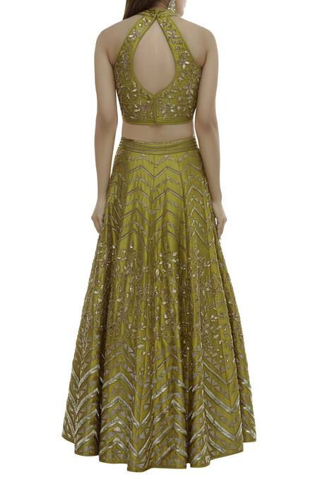 Green Dupion Silk Halter Neck Embroidered Lehenga Set