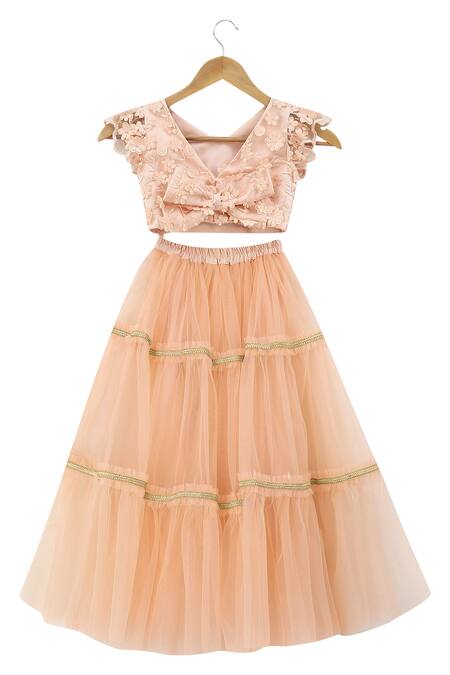 Peach lehenga set featuring a blouse with 3D flower embroidery and cap sleeves. Paired with a net layered skirt adorned with lace trim and a V back design.