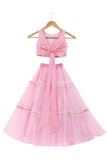 Pink lehenga set featuring a sleeveless blouse with ghoongroo embellishments and a tiered lehenga. The skirt includes lace detailing and a net layered design, complemented by a bow at the back of the crop top.