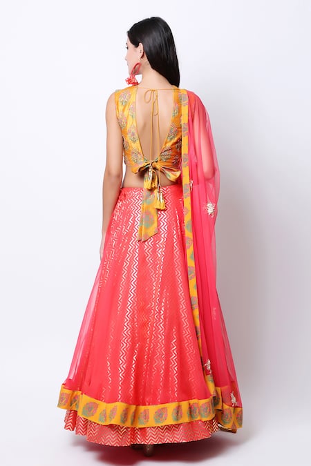 Ochre blouse with all-over floral motif work. Comes with coral layered lehenga & tassel border dupatta.