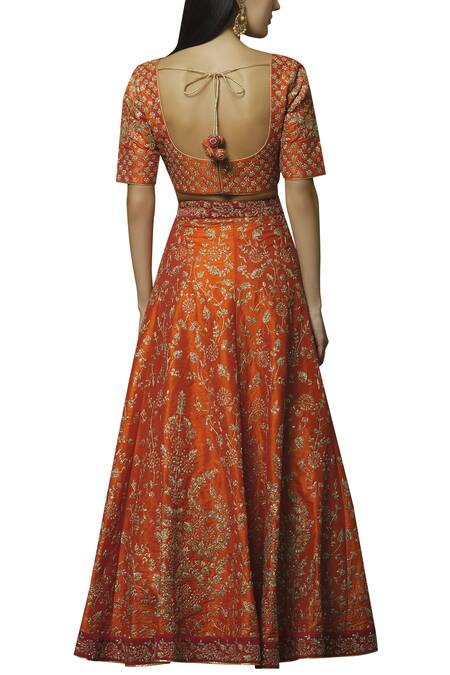 Orange Dupion Raw Silk Leaf Neck Embroidered Bridal Lehenga Set