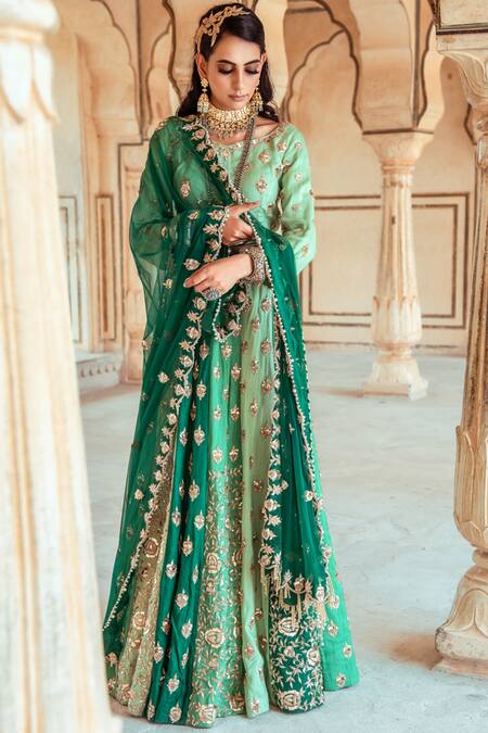 Green blouse with all over floral motif embroidery. Comes with lehenga & dupatta.