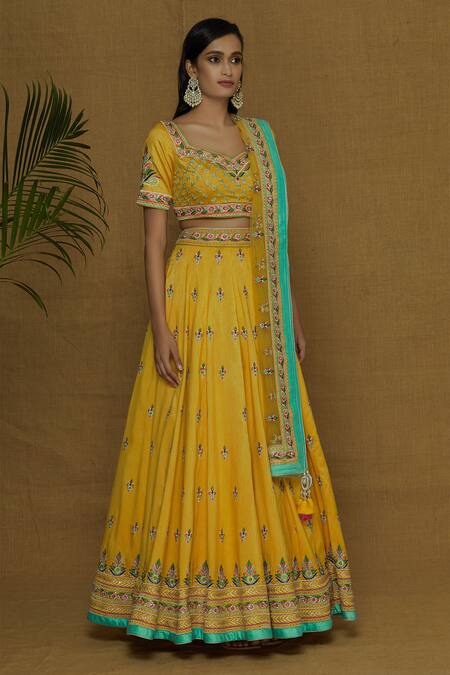 Yellow lehenga featuring floral thread and dabka motifs with a wide sweetheart neckline. Paired with a blouse and contrast hem dupatta.