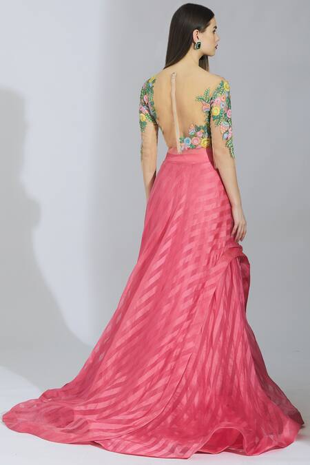 Pink flared lehenga with asymmetric layered styling. Paired with floral embroidered sheer blouse.