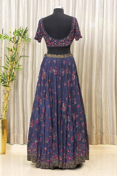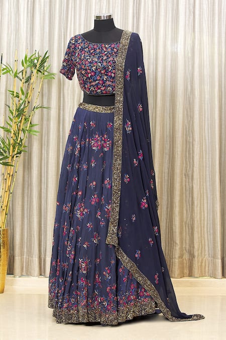 Blue lehenga set with floral embroidered all over paired with blouse & dupatta.