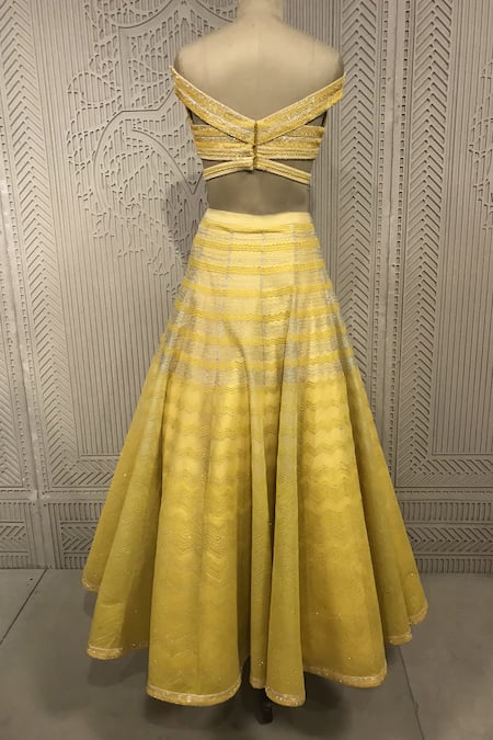 Yellow high waist lehenga with sequin motifs. Comes with crop blouse and dupatta.