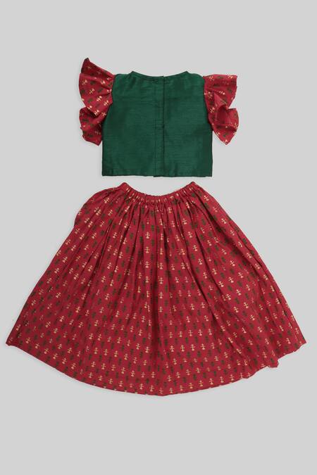 Red lehenga featuring floral printed motifs and an elasticated waistband. Paired with a green blouse adorned with placement bird embroidery and frill sleeves.