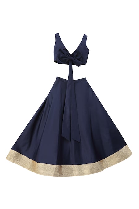 Navy blue lehenga featuring a contrast border and tassel tie-up detail. Paired with a hand-embroidered blouse showcasing fringe and back bow details.