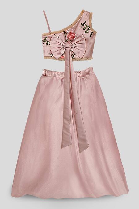 Onion pink lehenga featuring a floral embroidered one shoulder blouse. Paired with a sleeveless design and a back bow detail.