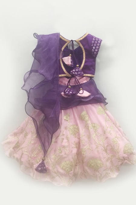 Pink lehenga featuring floral embroidered motifs with a tassel detail. Paired with a purple embroidered top and dupatta with a back cutout tassel tie-up.