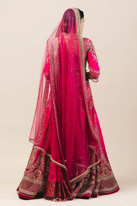 Fuschia 14 panelled lehenga with zardozi worked motifs. Comes with raw silk blouse , net dupatta and an embellished veil.