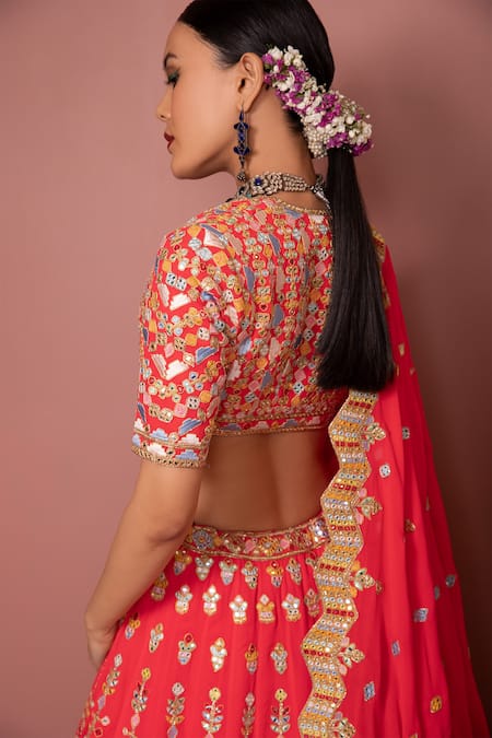 Pink lehenga highlighted intricate floral embroidery. Comes with plunging neckline blouse and cutwork dupatta.