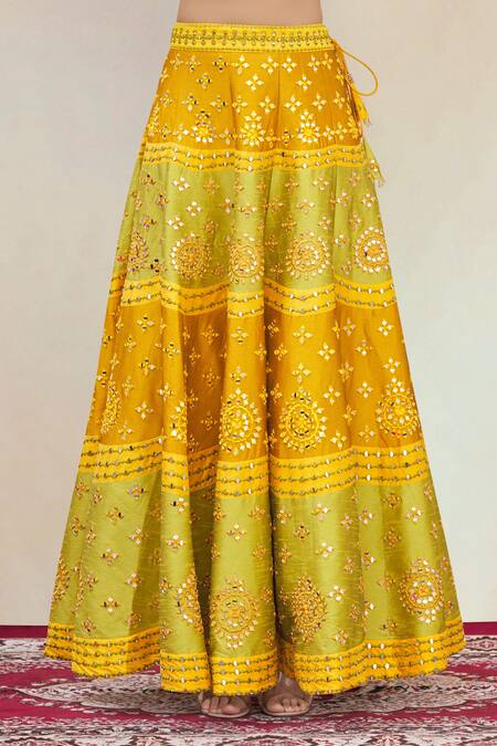 Green-mustard lehenga highlighted with chevron panel, mirror-thread embroidery & drawstring with tassels at the waist. Comes with corset-style blouse & dupatta.