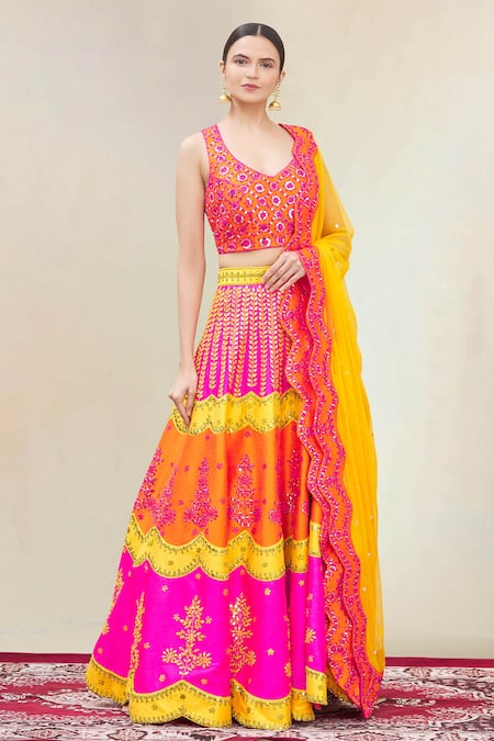 Fuchsia pink-yellow-orange lehenga highlighted with mirror-thread embroidery, drawstring with tassels at the waist & scallop edged hem. Comes with criss-cross back blouse & dupatta.