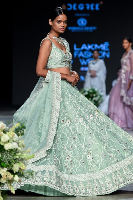 Green Organza V Neck Embroidered Bridal Lehenga Set