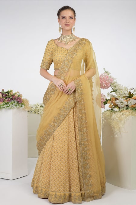 Gold lehenga highlighted with chikankari & zardozi hand embroidery. Comes with sweetheart front neckline blouse & silk organza dupatta.