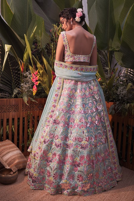 Turquoise lehenga with mirror work, multicolor thread embroidery and gota patti trims. Comes with blouse and dupatta.